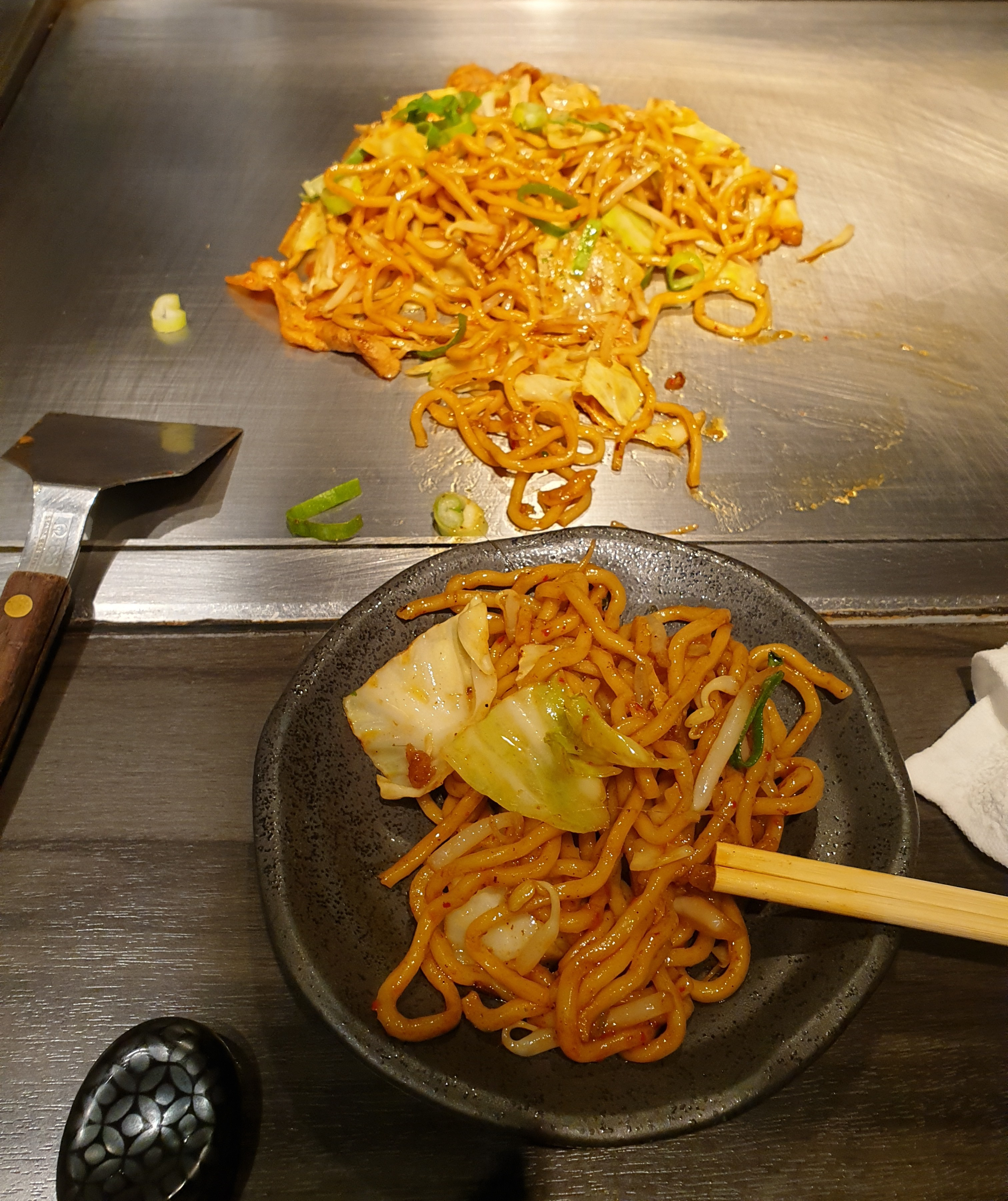 After I had been taught by my expert friend how to use the hot plate, I dared to venture to a hot plate place on my own for very late lunch the next day. But as I had just eaten okonomiyaki, I wanted to try something else. So I tried yakisoba. With kimchi. Kimchi, of course, is Korean, but I love the stuff, so I usually seized my chance to have some.
