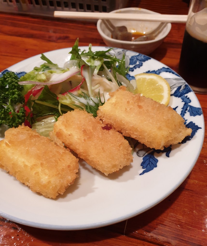 The mistake of this evening, however, was telling the owner “omakase (chef’s choice), 5 from this list”. Said list included, as far as I could tell based on some help from Google Translate, the yakitoris and other smaller izakaya things. Well, as it turns out, his “omakase” included rather big portions. I got some fried cheese, fried tofu, fried little fish, fried potato croquettes, and fish and vegetable tempura. I think two of these would have been enough for one person. And I still ate all 5. And had a beer to wash them down. After that I had to get out because I wasn’t sure if I was going to be sick from over-eating or not… Couldn’t even have any sake, even though I had planned to have some as dessert.