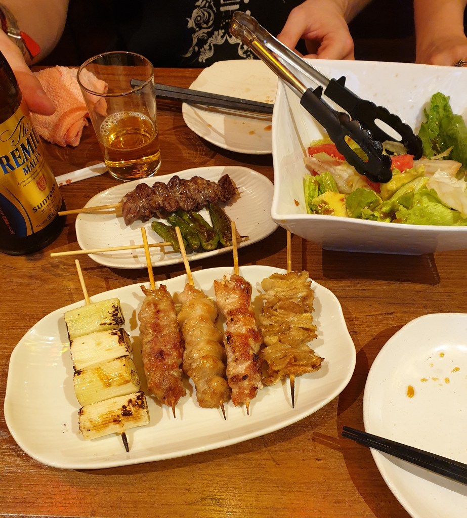 We walked around a bit, getting lost on the way as well (as it was a big and relatively confusing place) before we ended up choosing a chicken place with several yakitori options, some side dishes (such as salads, so exotic!), and, of course, fried chicken.