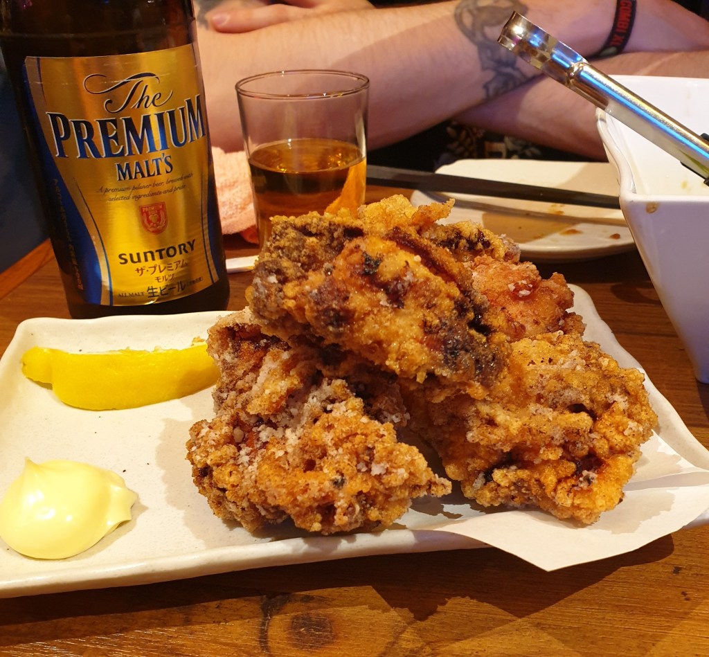 The Japanese love fried chicken. Apparently KFC is practically an institution there around the end of the year. My first foray into the fried chicken world, however, was at Kirin City, a sort of pub chain of the big Japanese beer brand. And I was dumb enough to order all three kinds of their fried chicken. One was with yuzu salt, one with their secret recipe, and one with parmesan and black pepper. And then I ate them all. Knowing I had also ordered more food. I am not very smart.
