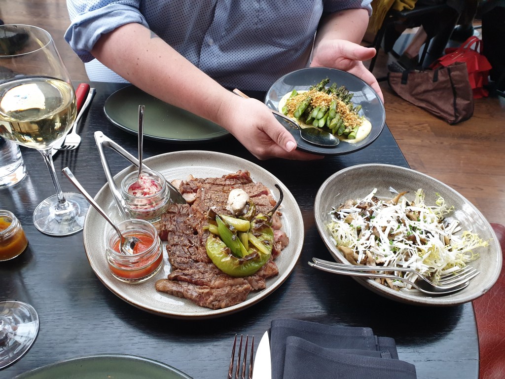 For the main dish the waitress managed to convice us to order the most expensive thing on the menu: dry-aged ribeye. And it was definitely worth every penny. We also had side dishes of grilled mushrooms and nori seaweed and grilled asparagus and egg sauce, but I have to say they were by far the least interesting parts of the whole meal. I’m sort of glad this sort of super fancy meat is really expensive, because otherwise my plan to cut down a bit on meat consumption would be very much in trouble.